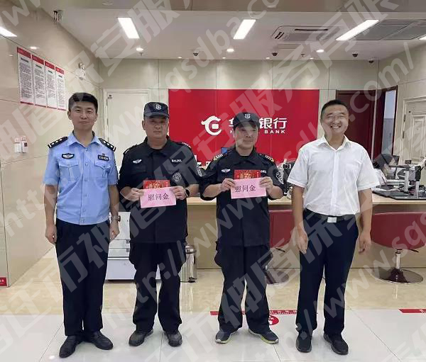 7月27日下午,宿遷市公安局宿城分局府苑派出所民警上門送獎,對宿遷市神盾保安服務(wù)有限公司駐華夏銀行保安員李成偉、張繼勇當(dāng)日凌晨協(xié)助抓獲“拉車門”盜竊嫌疑人進(jìn)行獎勵。
